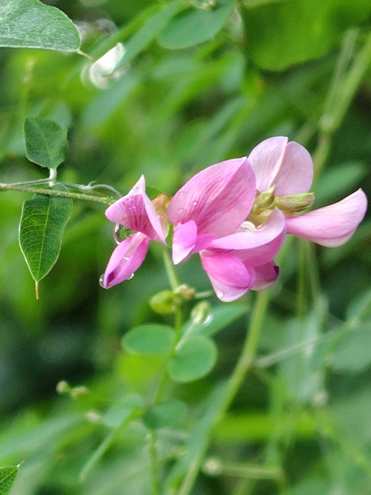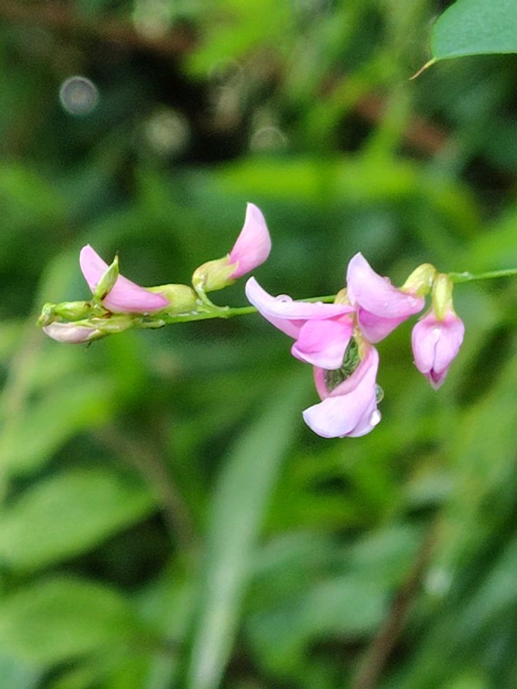 エンドウのような総状花序となり、長さ12〜15mmの蝶形の紅紫色の花を付ける。