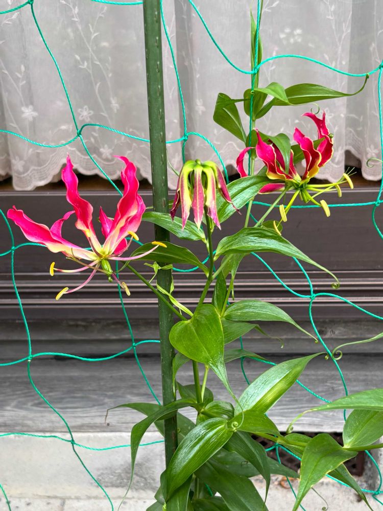 グロリオサ 綺麗に咲いて羨ましいです。なかなか出会えず、ご近所さんから切り花をもらっています。秋に販売するのかな〜?