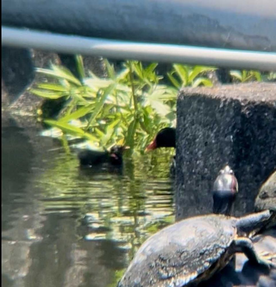 このカメ🐢さん、いつもこの場所でのんびりとくつろいでいますが、興味があったんでしょうね。首を伸ばしてバン親子を見ているように感じました🤭笑