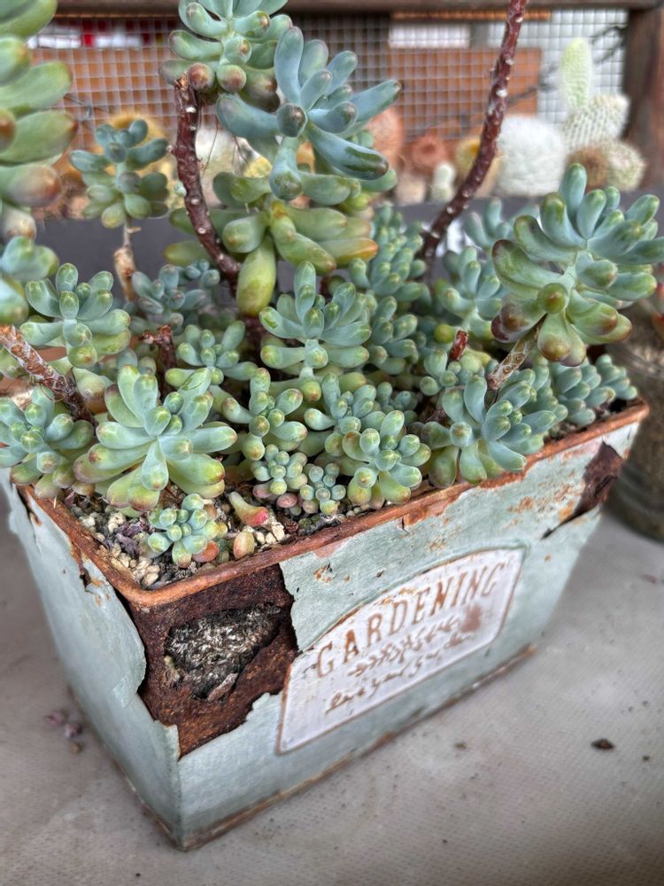 乙女さん、このブリキ缶に植えて3年くらいたつけど、この感じが気に入ってて、ずっと植えっぱなしなの😅