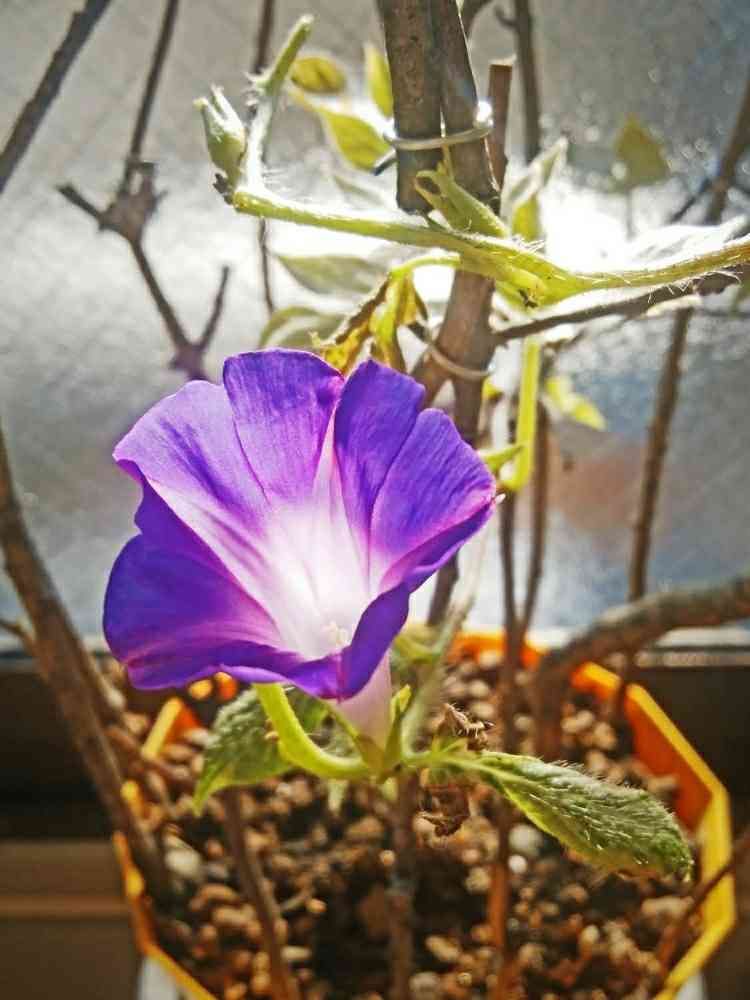 スマホ📱で普通に撮った小さな朝顔「恋しぐれ」葉っぱ🌿が寂しい💦
