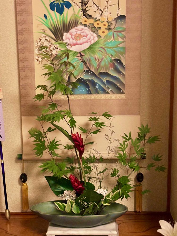 先週飾った生け花の花材が一部元気だったので、今週の花材と混ぜて創作盛花してみました。