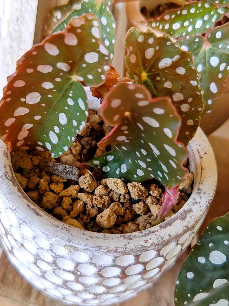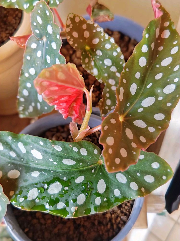 ベゴニアマクラータのその後😆。友人に貰ったマクラータ、挿し芽して次々増えてます。ドット柄が可愛い🥰裏は赤い葉。4枚めが親株。