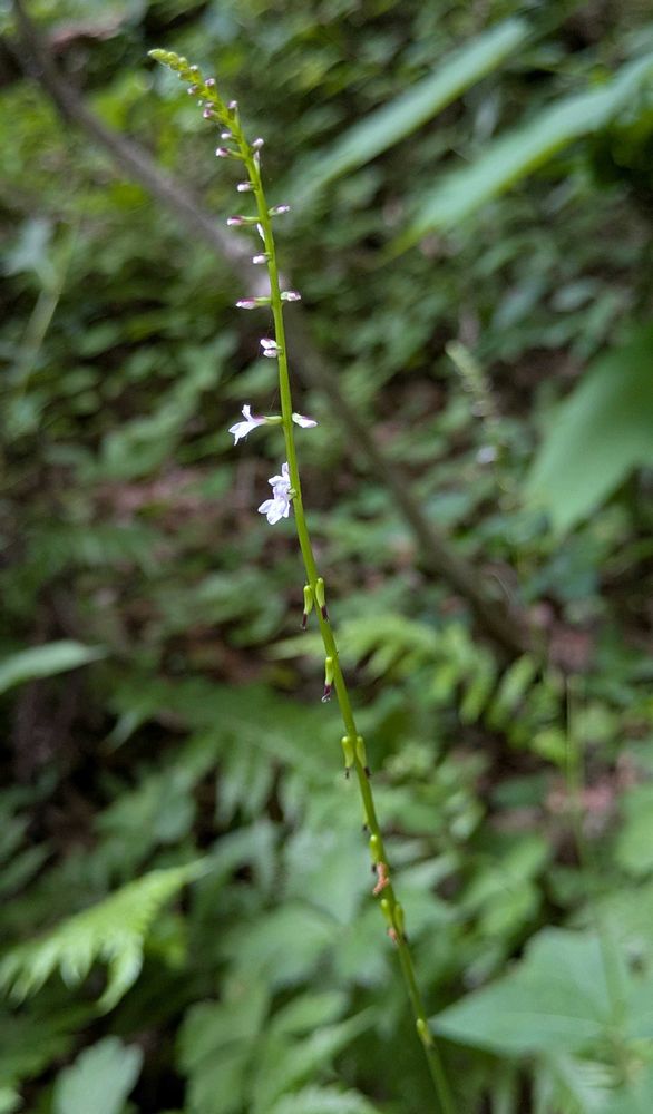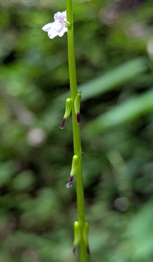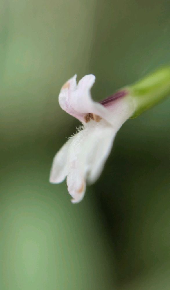 花ははじめ上向きだが、花時には横向きで上唇は2裂、下唇は3裂の小さな花が穂状に下から咲いていく🩷
