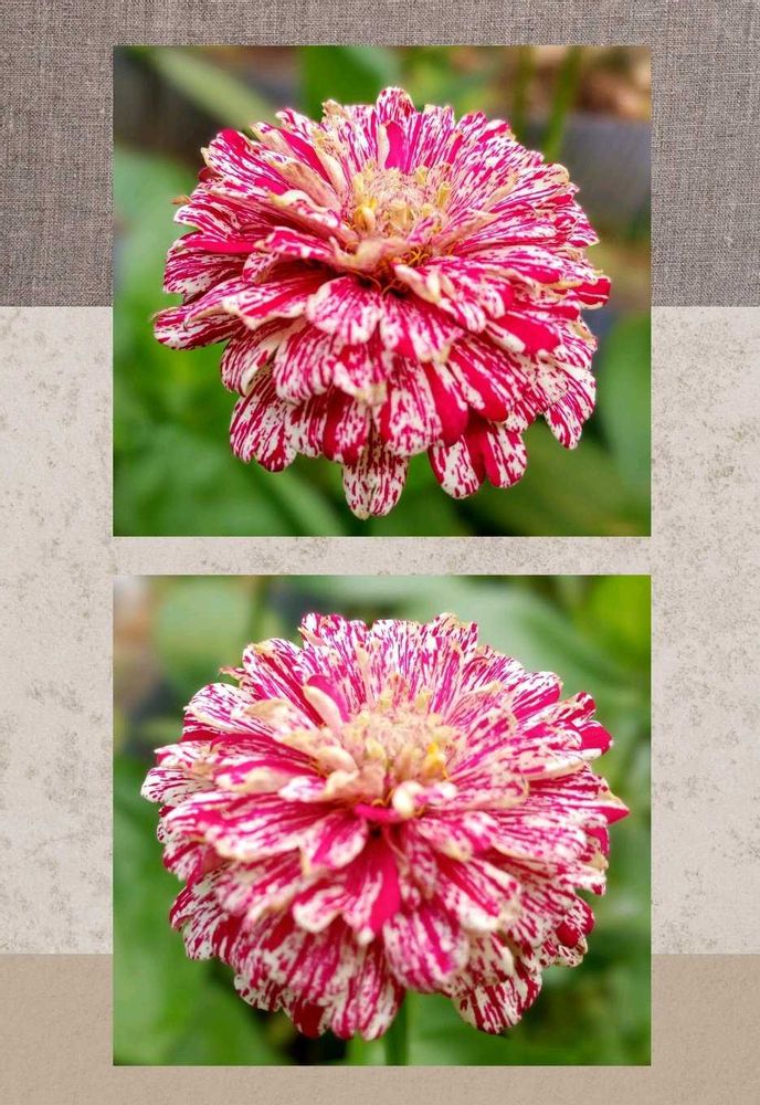 ✤ジニア「ポップアート、ホワイト&レッド」の花弁が幾重にも💮❤️🤍🌿。昨年には無かった色バランス💝