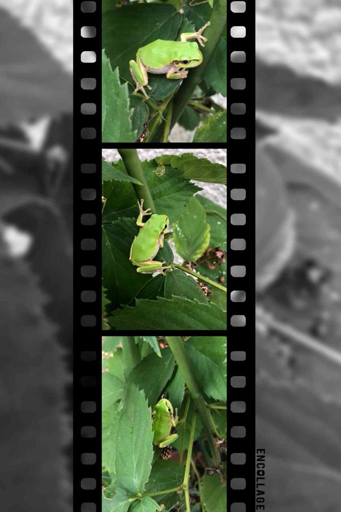 葉っぱの陰に隠れてたアマガエル君、私がのぞいたらよじ登って出てきました😊