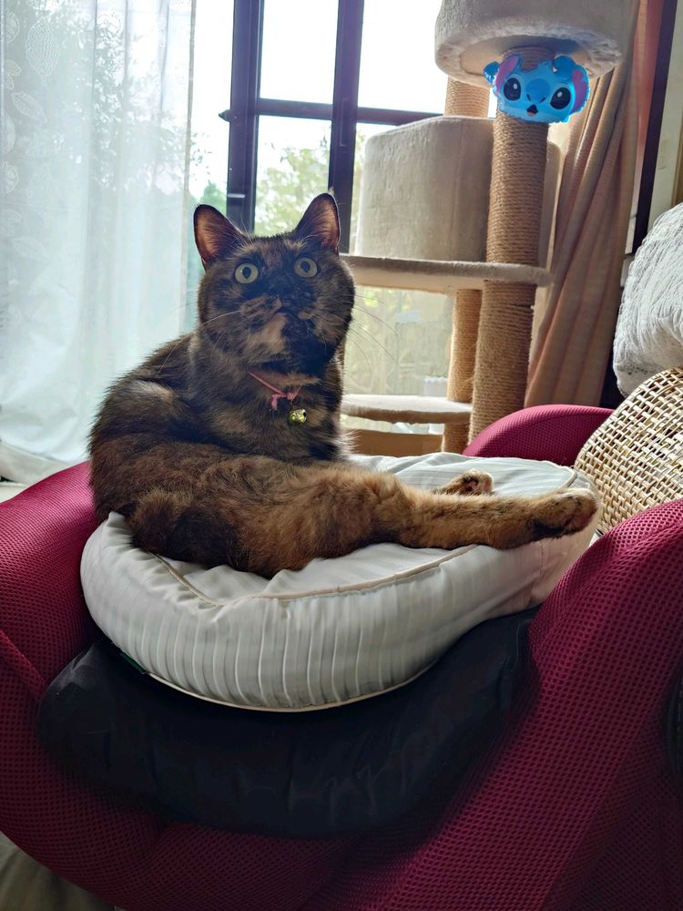 ばぁば👵のマッサージチェアに低反発クッションを重ね、さらにAfternoonTeaの丸クッションを重ねた上にどっかりと君臨するお猫様っぷり(笑)