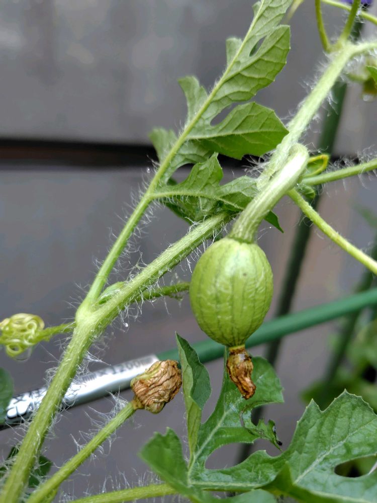 ちい〜さい雌花から少し大きくなった小玉スイカこれは摘果せずこのまま見守る予定です どうなるか楽しみですが、猛暑と水やりの戦いになりそうです。