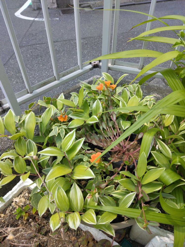 【3】アマドコロと蔓ニチニチソウの鉢の中にポリ容器のままポーチュラカオレンジ色💛