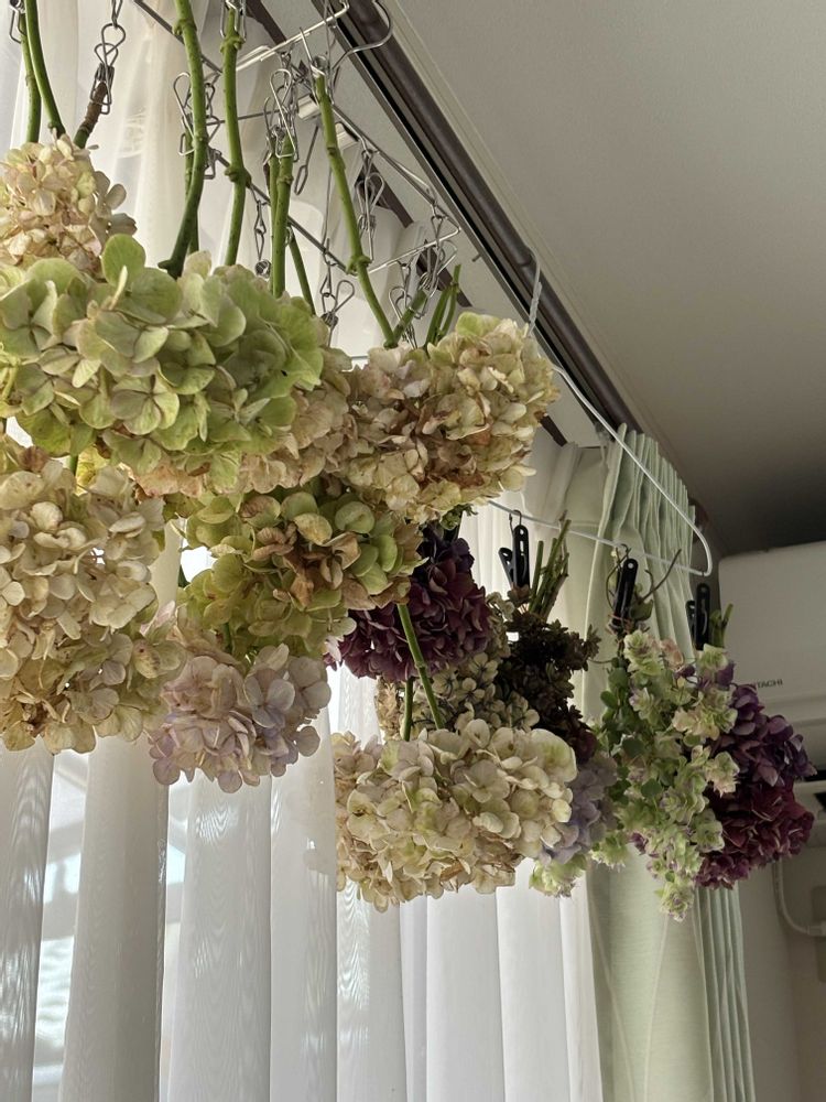 ❷✂️した「アジサイ」はクーラーの前に吊るしてドライにしてみます。
