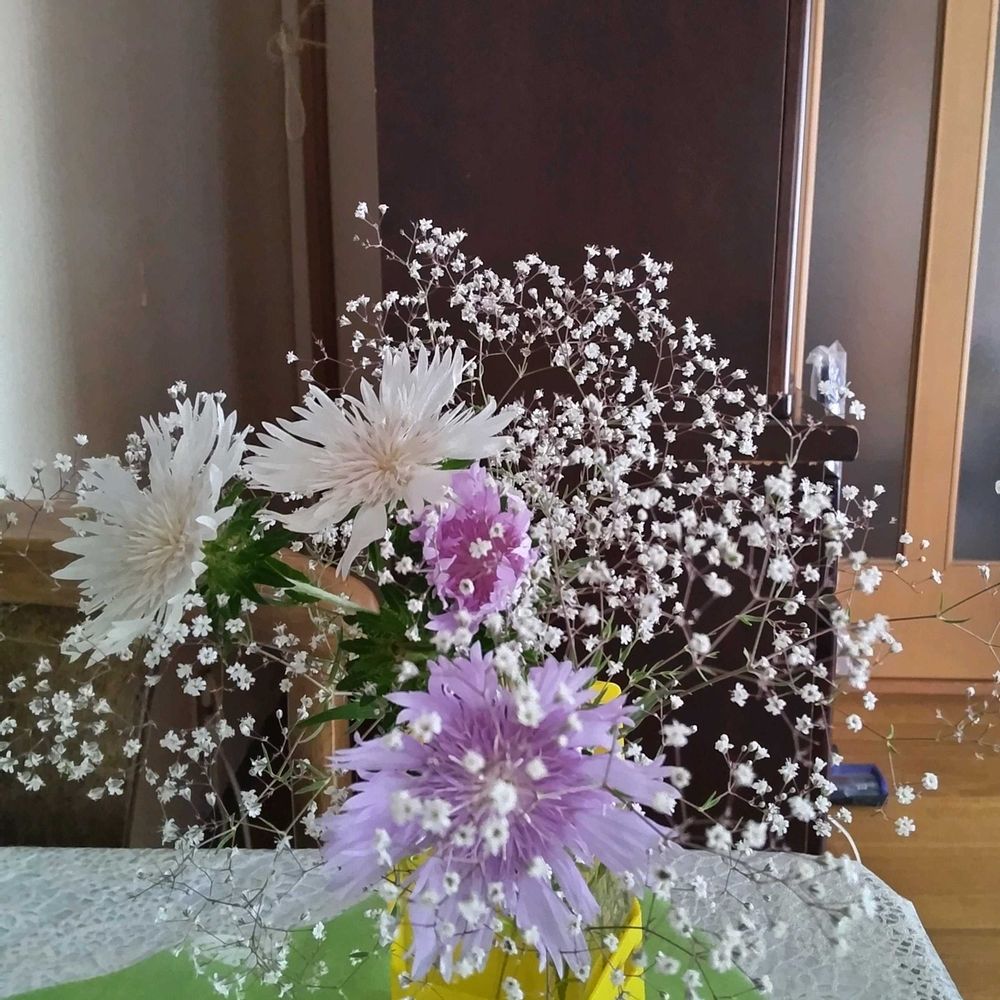 かすみそうとストケシアを飾ってみました🤍💜🤍