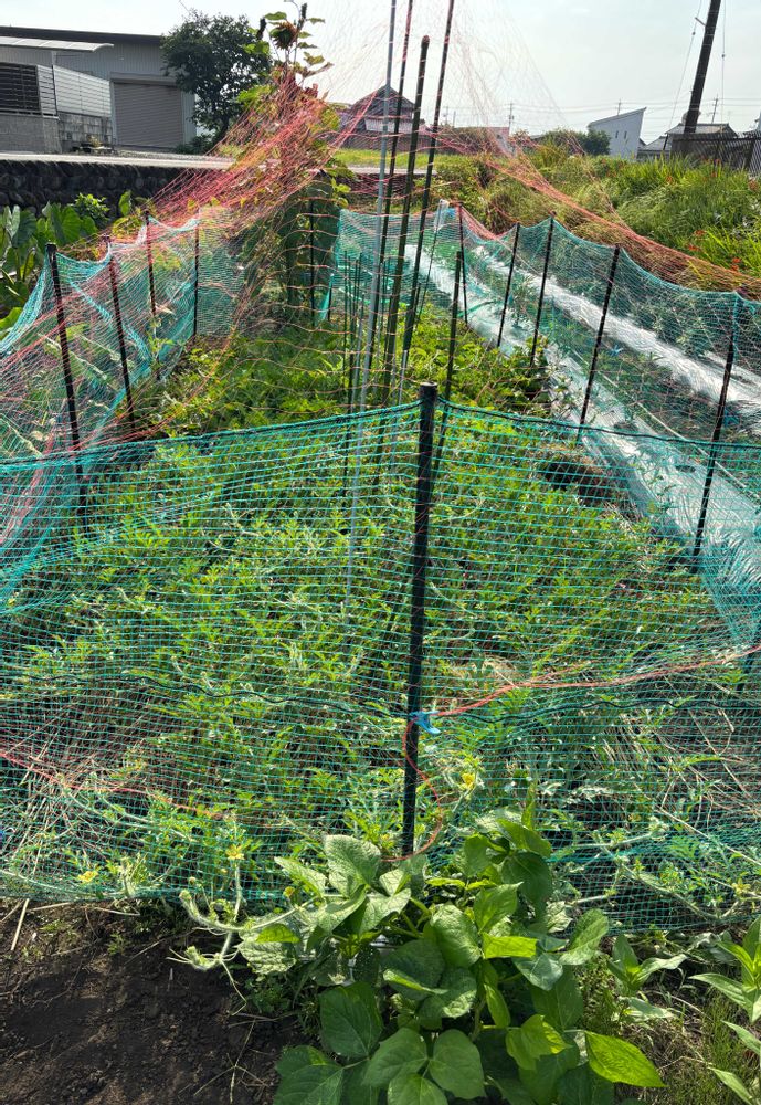 ⑸ 隣の畑のおじさんがもうカラスに2つも突かれてしまったから網をかけなきゃいけないよと教えてくださったので見よう見まねでネット掛けました😊