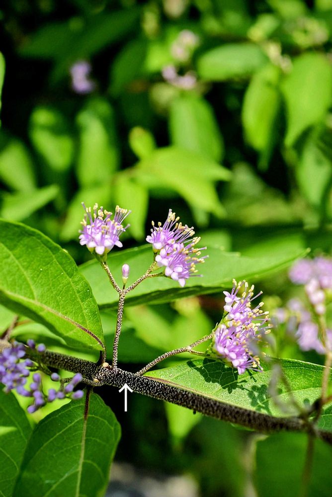 花の付き方は、ムラサキシキブは 葉の葉腋(付け根)から 花序が出るのに対し、コムラサキは葉に関係無く 枝から直接 花序が出ます(2枚目)。ムラサキシキブは 葉1枚に対して 花序がひとつ、コムラサキは 葉の近くの枝から 複数 花序が出ます。そのため、コムラサキの方が 圧倒的に 花数が 多いことになります。