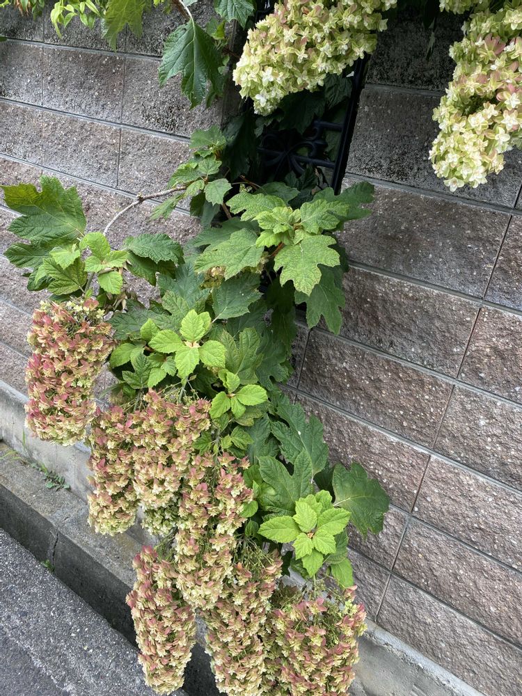 ご近所の塀から溢れるカシワバアジサイのお花が、グリーンに変化していました😆💚
