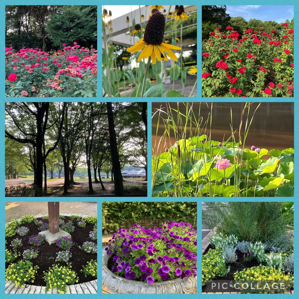 早朝散歩、6時台のウォーキングです。ハスが咲いてました。バラ園の🌹まだ品種によってはたくさん咲いていて。あとは花壇の植栽が、色バランス考えられていて綺麗にしてあるんですよ😍
