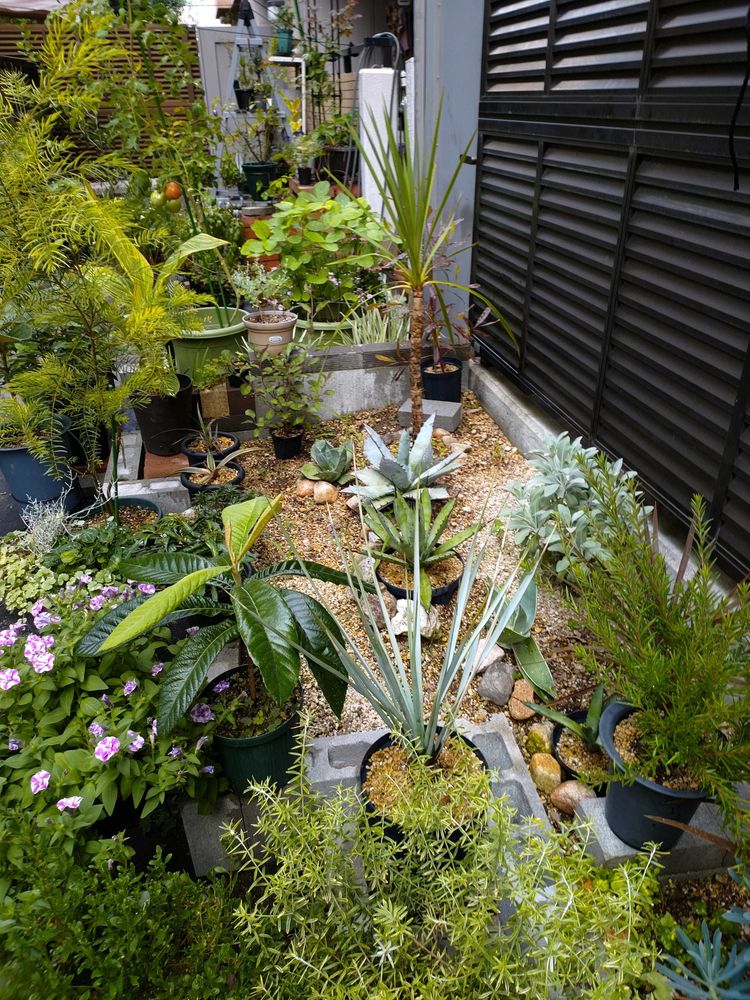 地に直接植えてる物や鉢ごと植えてる物、花壇の周りは鉢物を置いてます☺️