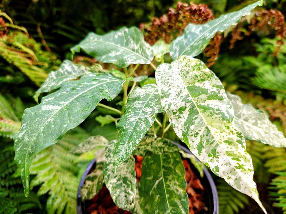 フィカス・アスペラ 'パーセリー' (Ficus aspera 'Parcellii') は、クワ科フィカス属の常緑性の低木または小高木で、その美しい斑入りの葉が特徴の観葉植物です。別名「クラウンフィグ (Clown Fig)」や「モザイクフィグ (Mosaic Fig)」とも呼ばれます。