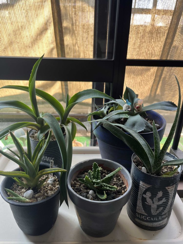 ②他のガステリア、ササノユキ錦たち。ヒロンさんにいただきました。リメ缶はカモミールさんから。みなさま、ありがと😃