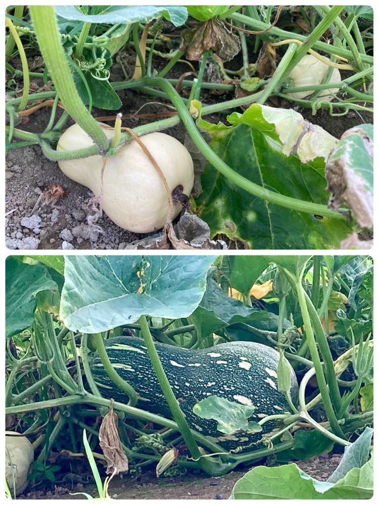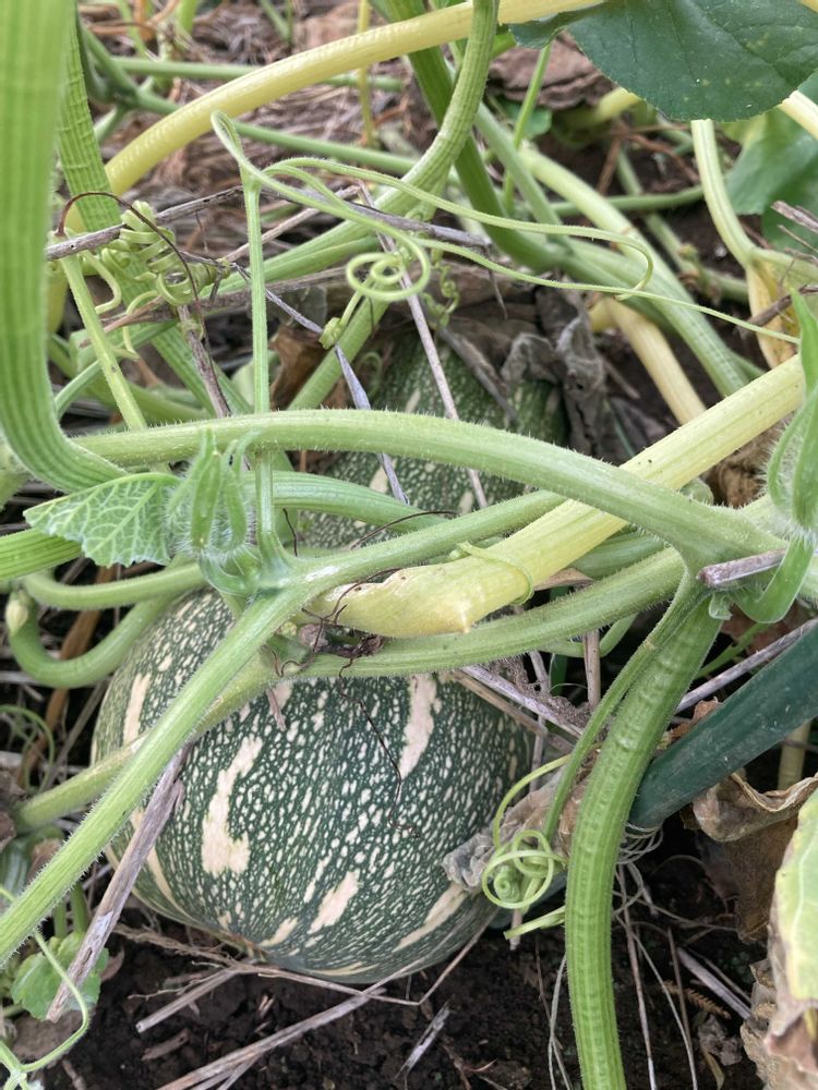 散歩コースの畑で「バターナッツカボチャ」が大きく育っていた。