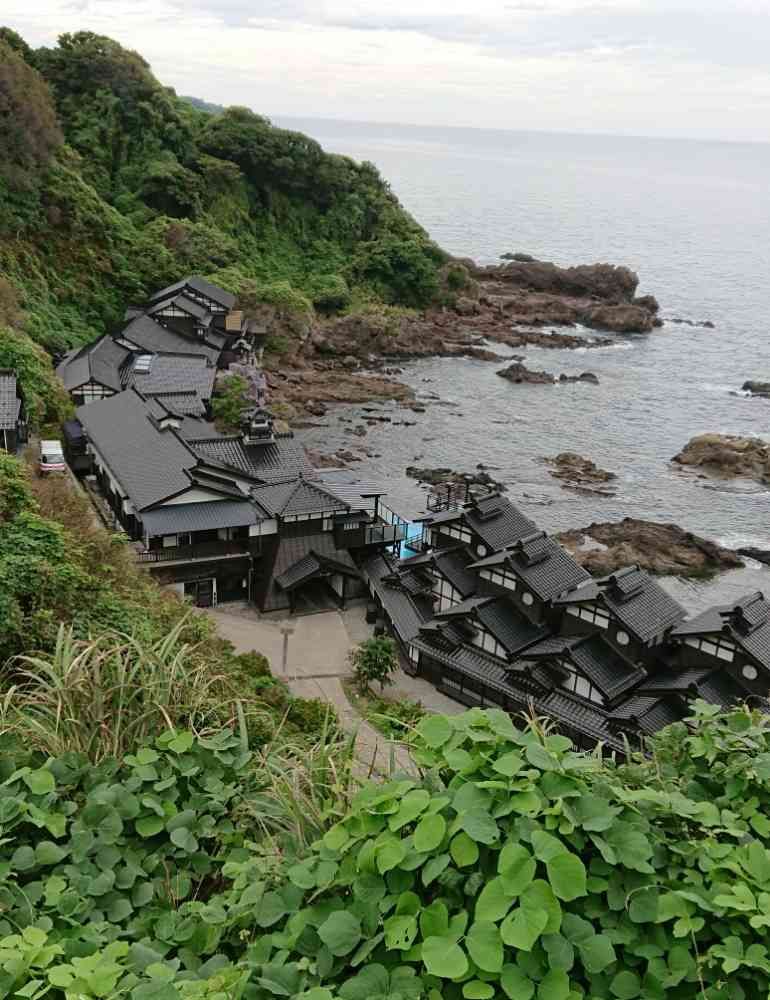この後、学生時代に行った思い出の曽々木海岸と見附島に寄って雨が降りだしたので一路宿へ🚙💨 台風で荒れる七尾湾と流れる雲を眺めながら露天風呂♨️😆 七尾市全域に避難勧告が出ているようだけど、ホテルは全く影響無いよ(*^.^*)🎵