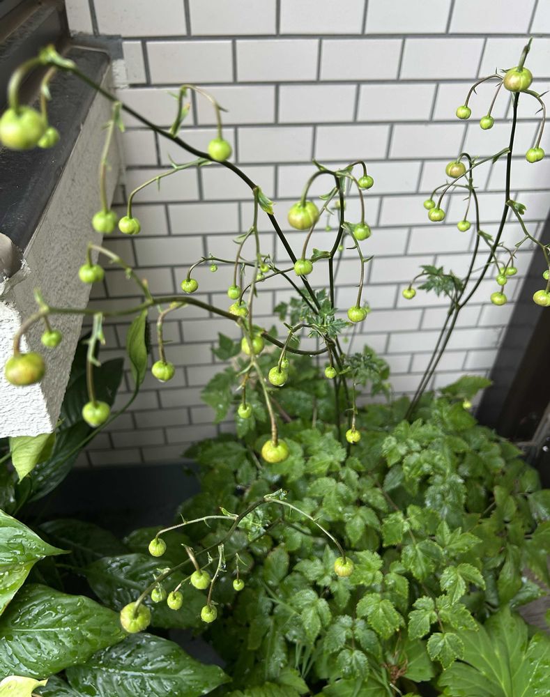 暑すぎて☀️も出ない、夕立ち☔️に雷⚡️⛈️。花茎が伸びて出窓下ではつっかえてしまったレンゲショウマはバルコニーの直射日光が当たらないところを求めて難民となり右往左往。森の妖精の居場所としてはなんとも殺風景な端っこに収まってます💦