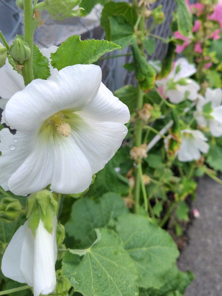 ⑤…🐕️散歩の途中、ほんの少しの土から咲いている野良のタチアオイ🤍🌿🌸🌿❤️🌿