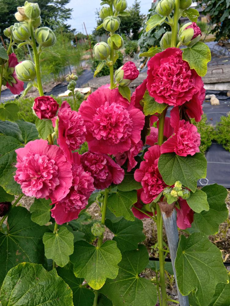 お友達の家のお花畑です 5種類の八重のタチアオイが並んで咲いていました とでも綺麗でした(っ>ω<c)✨❀.(*´▽`*)❀.