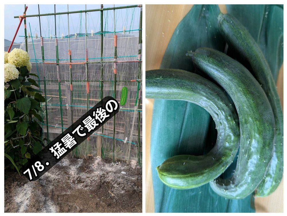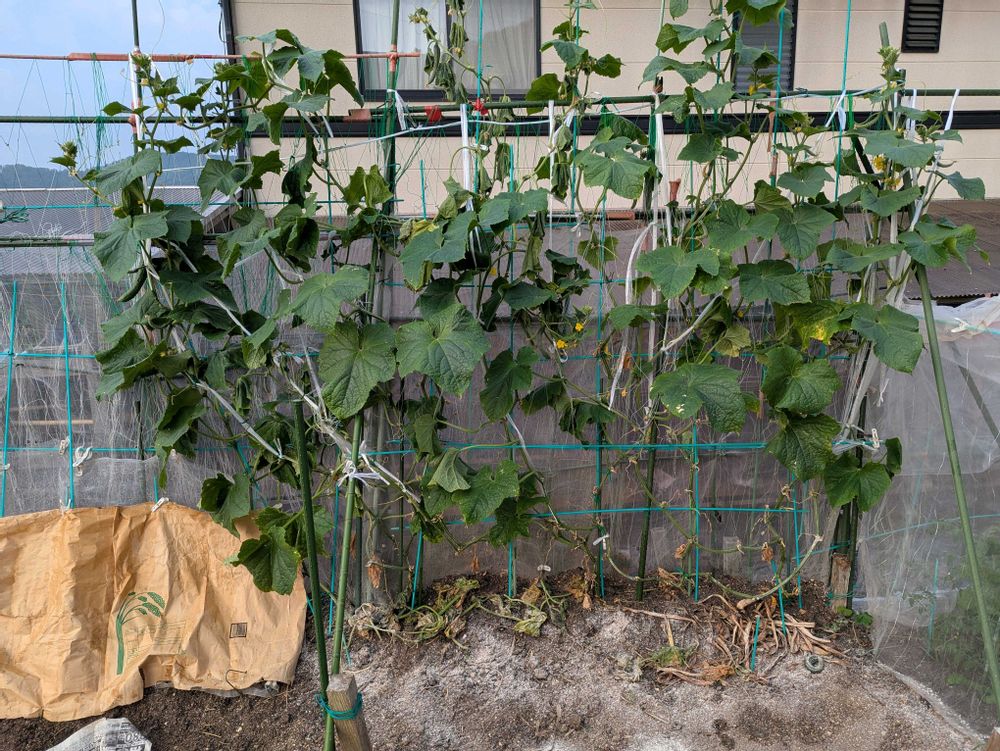 7/8.5時水やり、気温24度、キュウリが猛暑の為に終わりだよ、最後3本