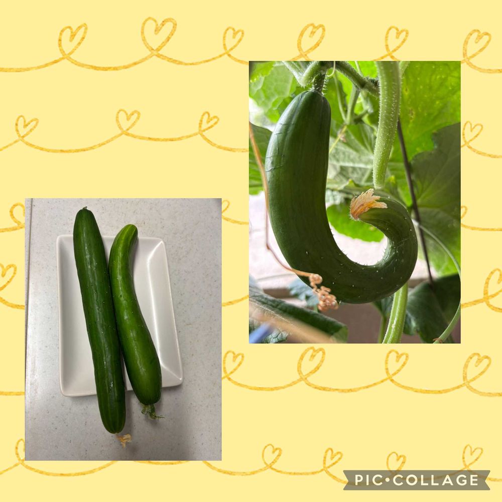 ↖️は収穫した物、↗️は今成長中のきゅうり