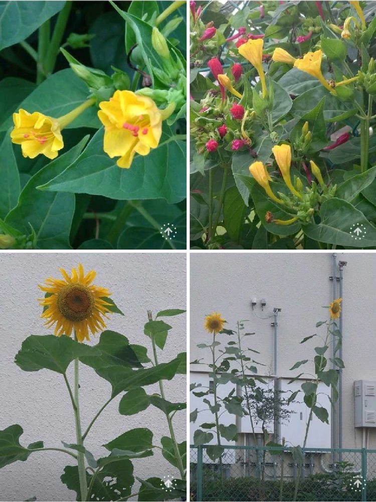 ❺フェンス際にオシロイバナと背高ヒマワリ🌻
