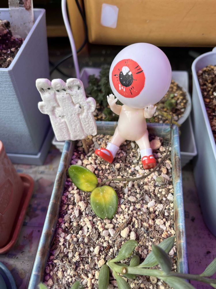 目玉の頭は、ピン球にアクリルマーカーで書いてるよ。ポジション決めて頭据えるのにアイスピック焼いて溶かして首の穴開けてます👍