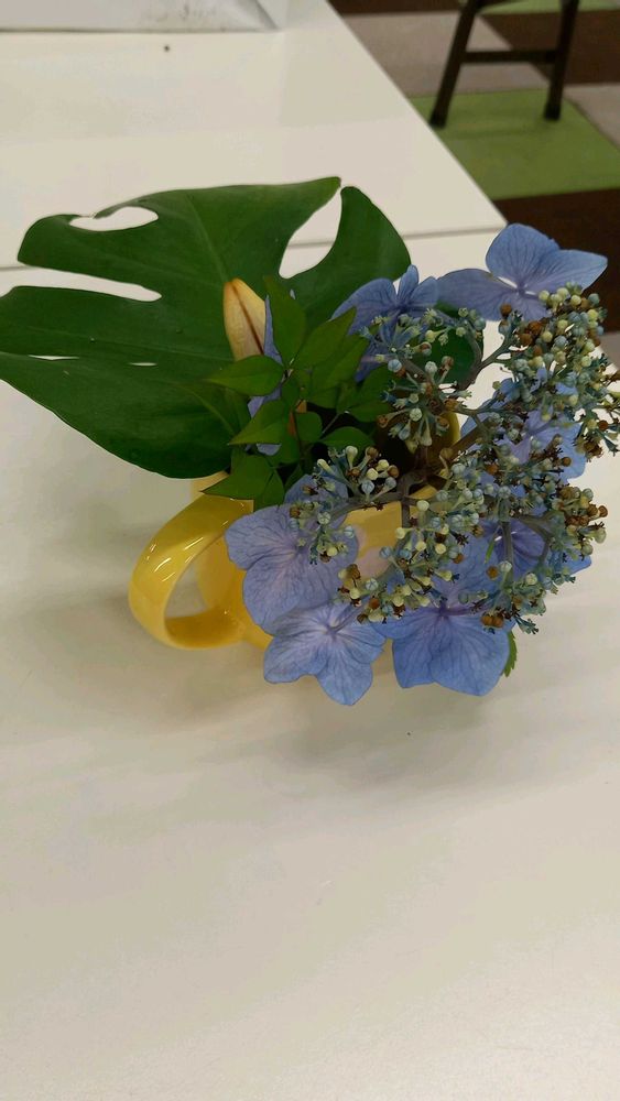 最後の紫陽花と百合の蕾、職場の方の差し入れモンテスラの葉🍀