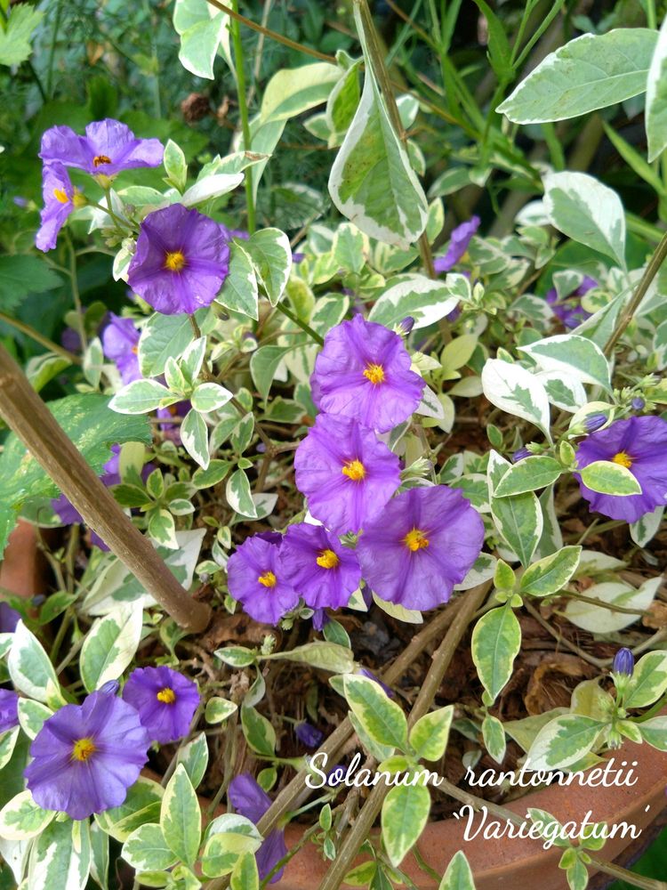 今春お迎えして、ずっと次々咲いてるソラナム ラントネッティー バリエガーダ💜 寒さには弱いらしいけれど秋まで咲いてくれるらしいし斑入り葉が涼やかで可愛いです💜