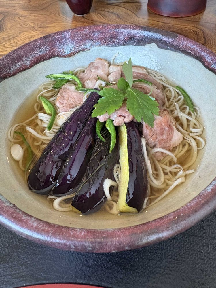 ②今日は冷やし鴨南蛮。利尻昆布、本節の出汁が効いていて、焼いた鴨肉🦆や揚げ茄子が全然脂っぽくなくて、とても美味しかったです😉👌