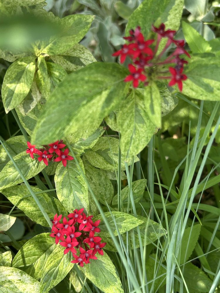 斑入り葉に真っ赤のお花が素敵ですね〜