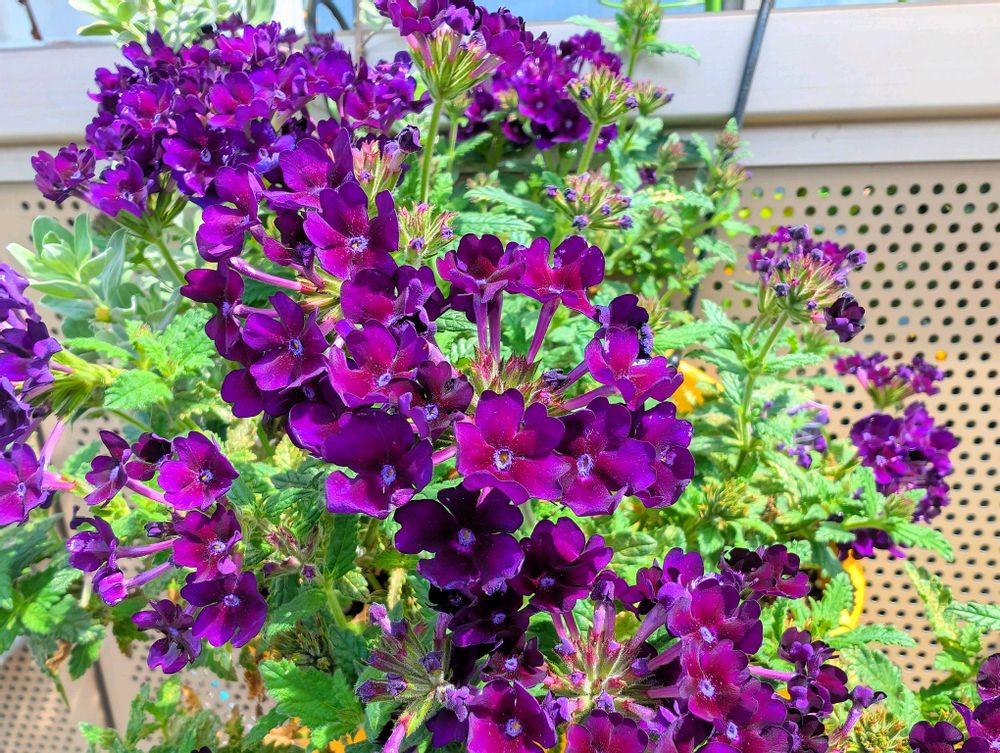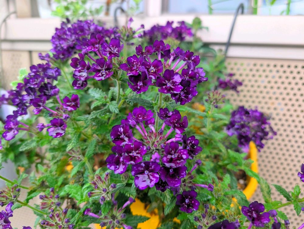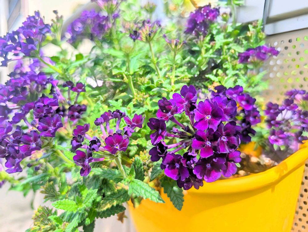 非常に濃いディープパープルの花色が特徴のバーベナ。まとまる草姿ではなくやや立性の性質ですが、とにかく花色が素晴らしいです。紫を際立たせるために黄色の鉢に植えてます。