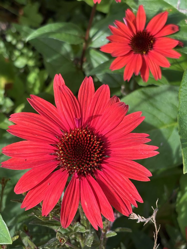 ①真っ赤なエキナセアさんがピンクの大きなエキナセアさんの下で咲いていました。