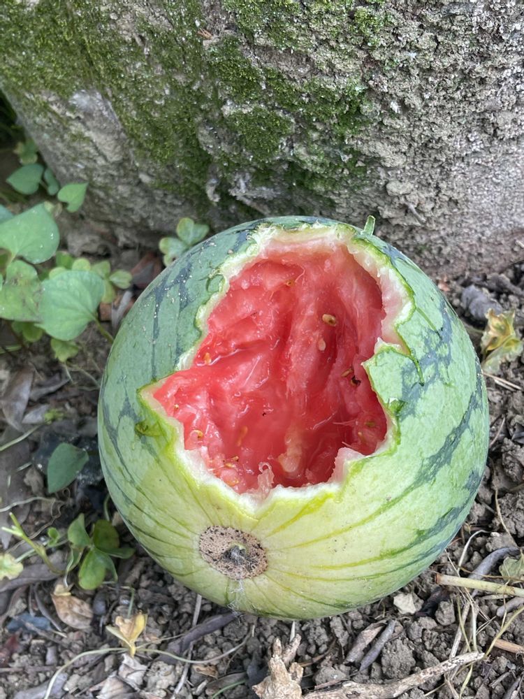 16時過ぎにスイカ🍉を見に行ったら、無惨な姿になって、かぶしてあるネットの外にありました。