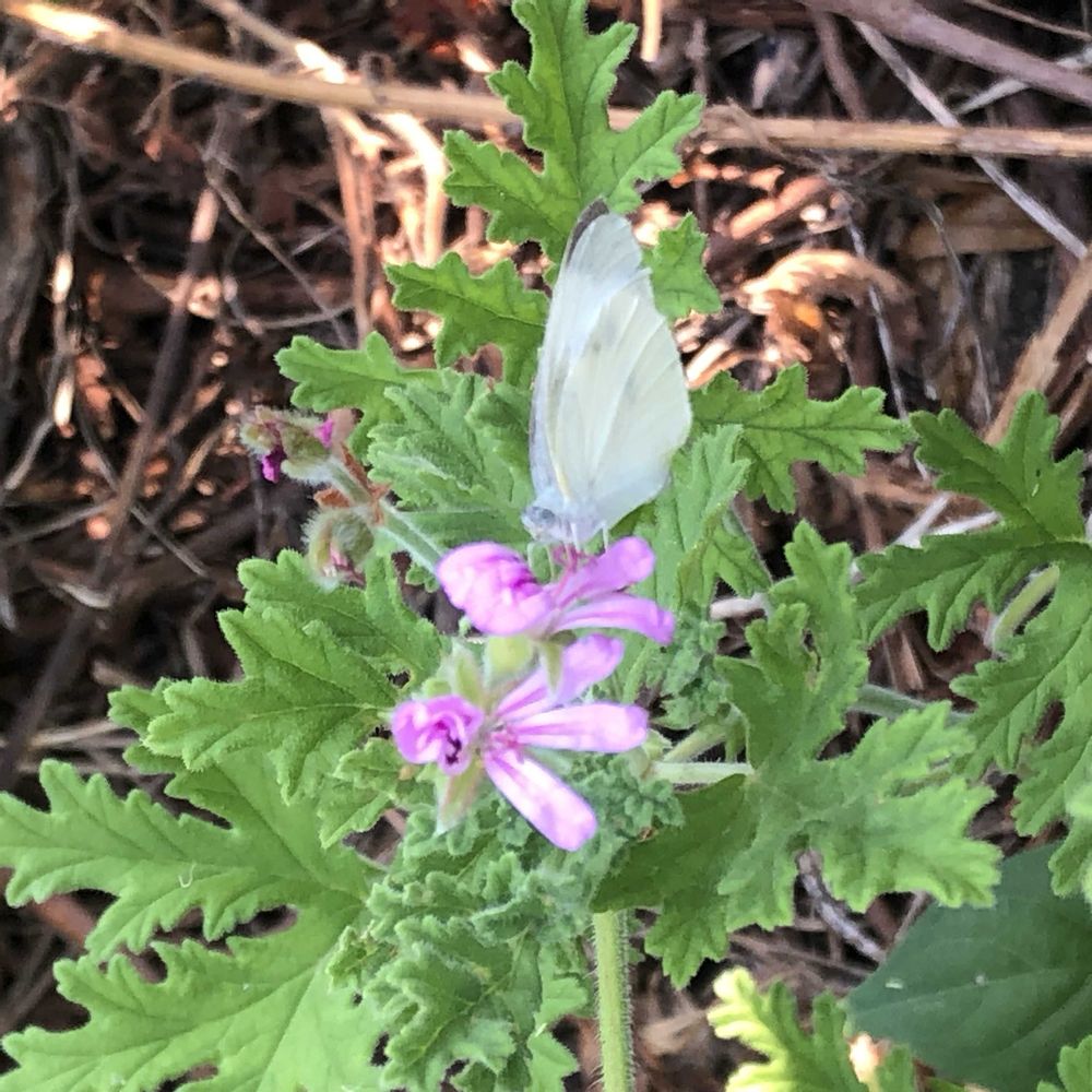 4.終盤のセンテッドゼラニウムと、今年は妙に遅くまでいるモンシロチョウ。留蝶化。幼虫の食草アブラナ科植物は今年はいないはずだが、なぜ?
