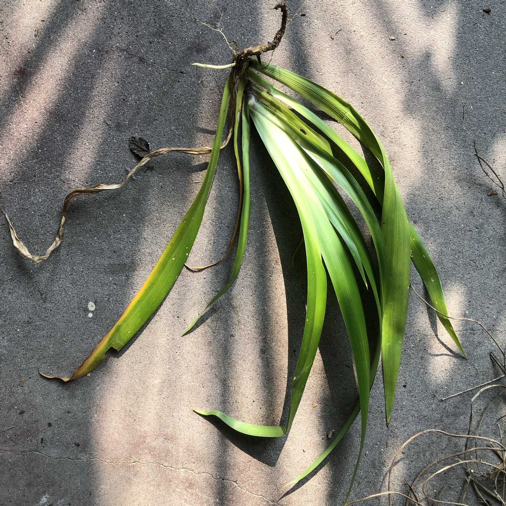5.ノアサガオを除去したら勢いで抜けてしまった南のシャガ。この機会に東に移植。土が固くて深く掘れなかったが、定着できるか。