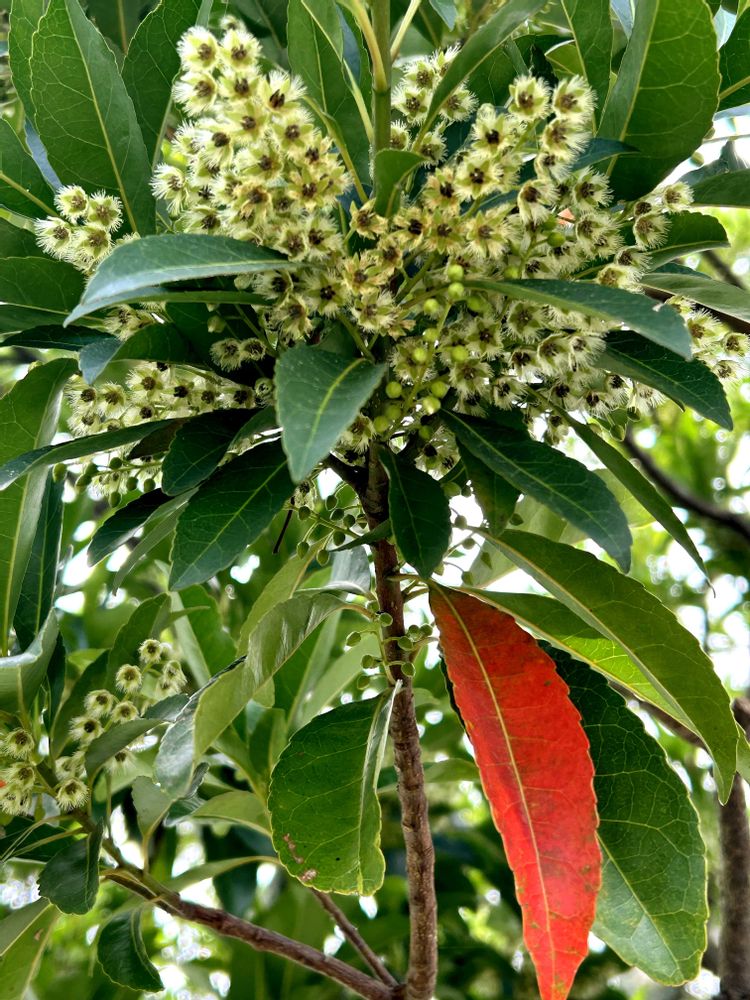 街路樹や公園に赤い葉が少しついている木があれば、ホルトの木かもしれないので、目立たない花ですが、下から覗くと咲いているかもしれないですね