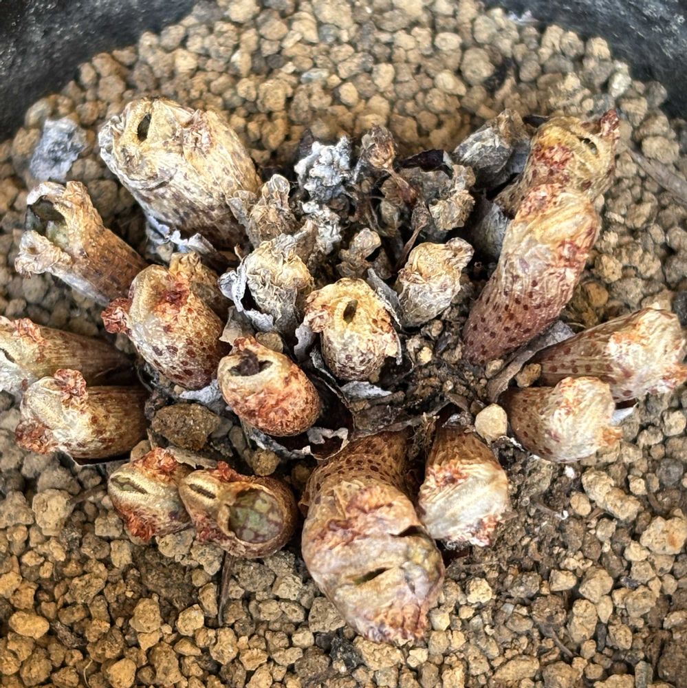 こんな気温なので 細根の為のチョロ水も 夕方霧吹きを高い位置で掛けるのみ 直にちょろっとあげたこが 次の日から溶けたので 恐ろしくてあげれません