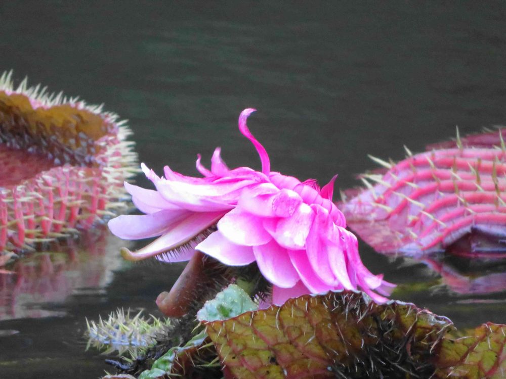 久々の植物公園。 オオオニバスが強風の中で咲きだしています。 なかなかこちらを向いてはくれません。 翌朝まで咲いててくれないかな?