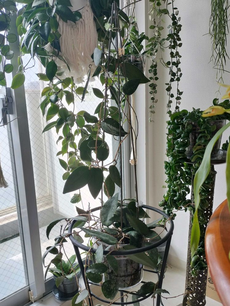 hoyas+αの愛しい時間.。.:*♡ 香りフェチです。 観葉初心者でしたが、何故かhoya沼に。 最近は香りの蘭も😺 ●蘭展 1.2.3.6は香り診査月♪ なぜこんなに、ホヤにはまったのか不思議でしたが、思い当たる部分は体質?? 🔹根っこが小さいのにカチコチの丈夫な葉っぱ 🔹シナシナした湿っぽさがなく、カラッとしてる 🔹観葉なのに花が咲いて良い香り。しかも狭い程咲く 🔹穏やかな日陰好き 🔹大して世話がかからない ちなみに蘭は?というと 🔹テクスチャーがホヤ似 🔹香り◎根っこ◎バルブ◎ 🔹邪魔にならない存在感と品格 そんな感じでしょうか🐦 小さい雀と、植物達の発するマイナスイオンの空間に住んでます🪺