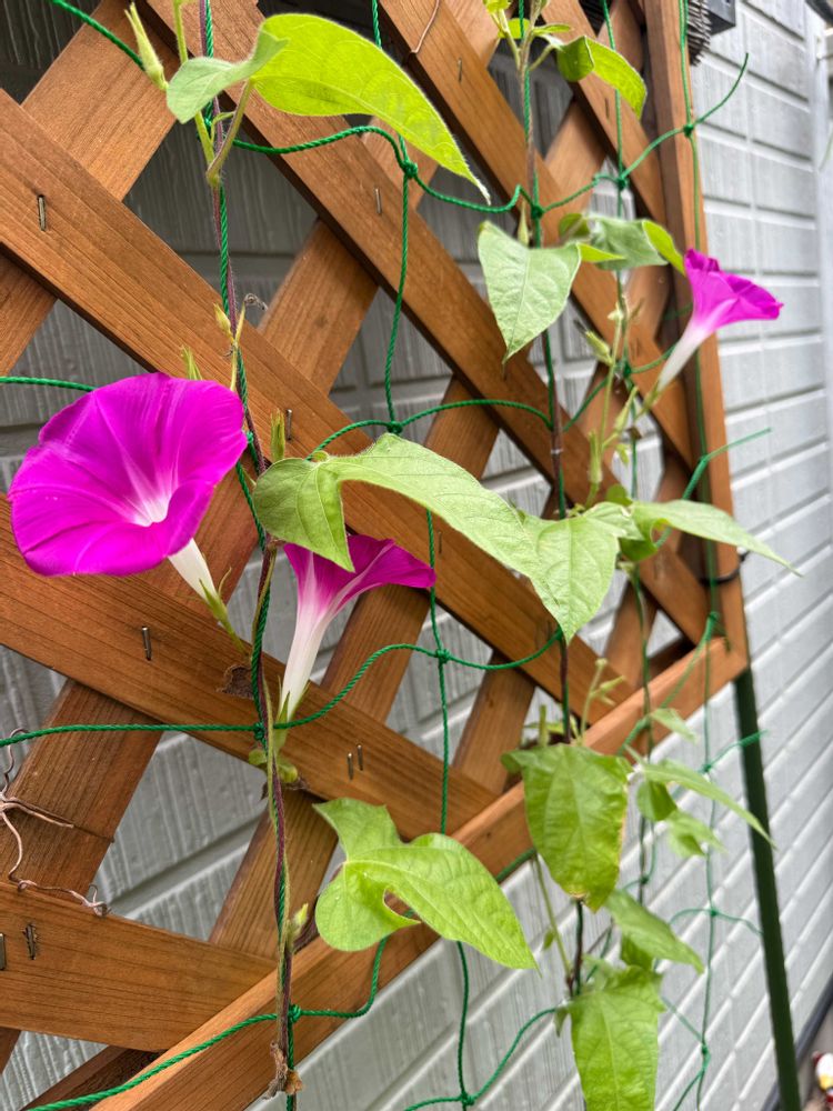朝顔のツルは風呂の面格子に触れると熱でやられてしまって茶色く枯れてしまいます💦夏の花の代表の朝顔もこの暑さに負けちゃってます💦💦