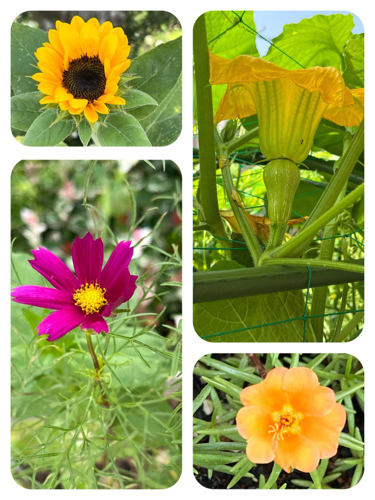おはようございます。晴れ、29.6℃、10:20ムシっと暑い。100均和花エレガントミックス63日目、小さなひまわり、コスモスが咲きました。バターナッツかぼちゃ3世87日目7号に人工受粉しました。松葉ぼたん2世97日目オレンジ色が咲きました。今日の収穫はエゴマ、大葉しそです。😍🥰😻😸😋☺️