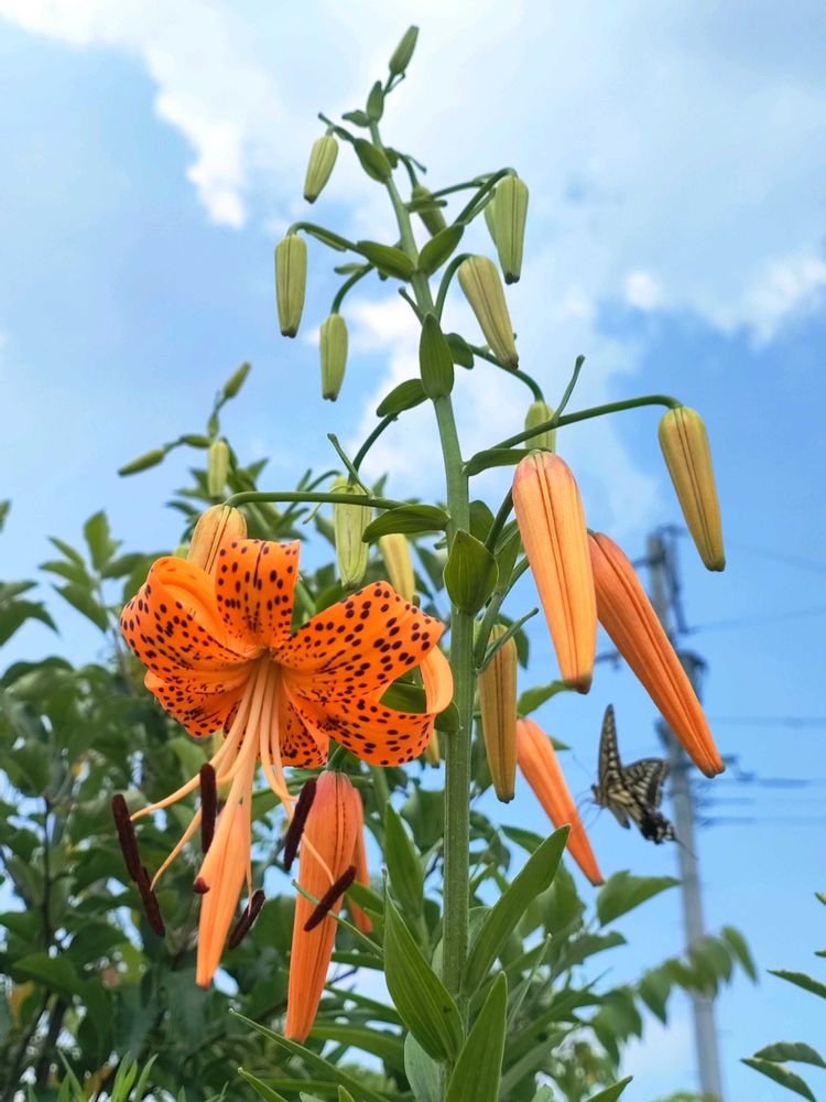 本日も暑いです。ユリ2種。オニユリいよいよ開花。いいねー。水やりしたのでちょうどアゲハ蝶も来ました。