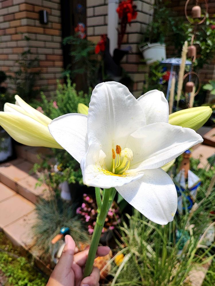 2.5mくらいに伸びた百合はテッポウユリ でした。さっさとカットして花瓶へ。支柱は一切立ててない、むしろうちの支柱より太い。1種類しか植えてないはずだけど、他の株たちより遅く咲いたのは巨大化したからかな。