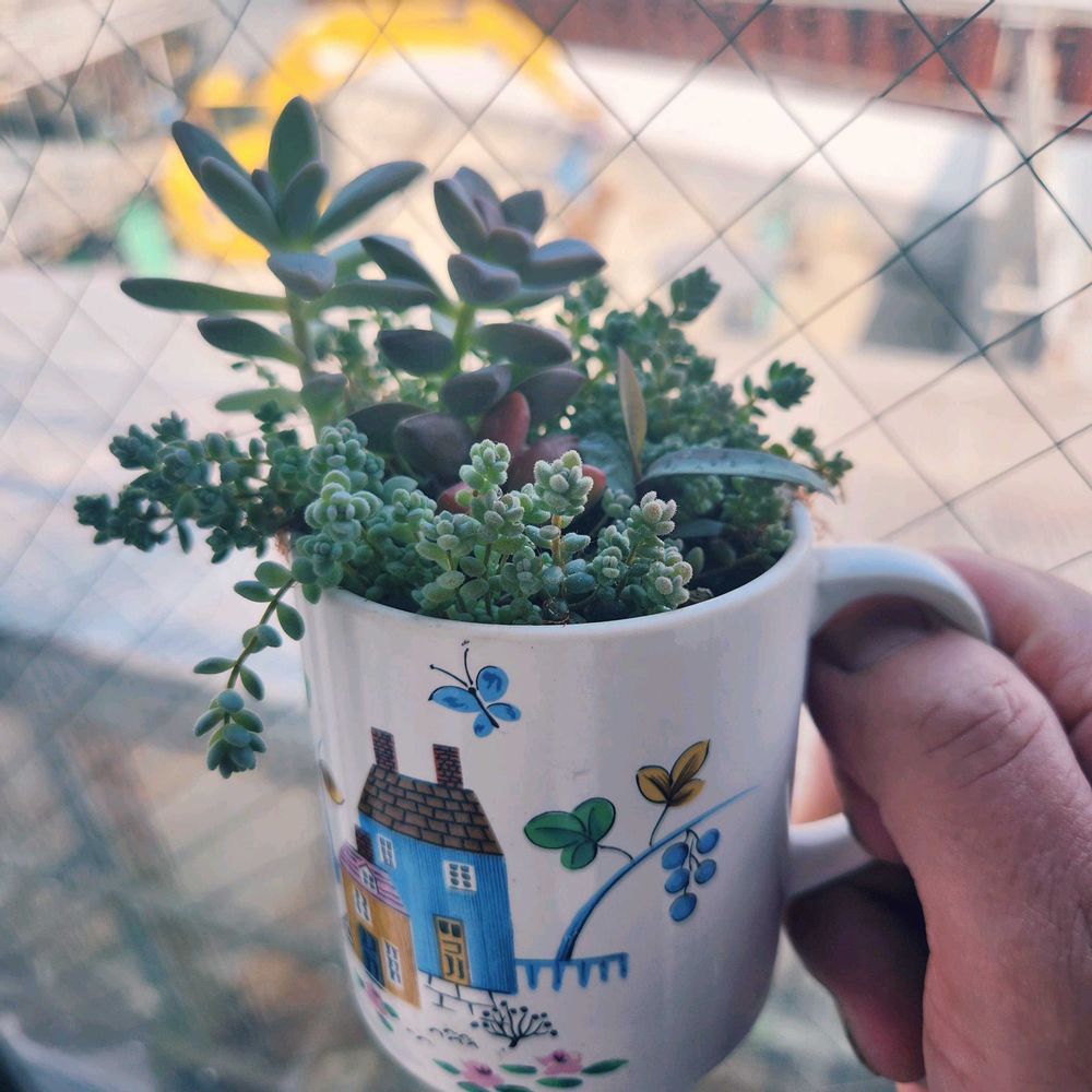 コーヒーカップに穴開けて作った鉢に多肉と今日のお花セダムの寄せ植え😅