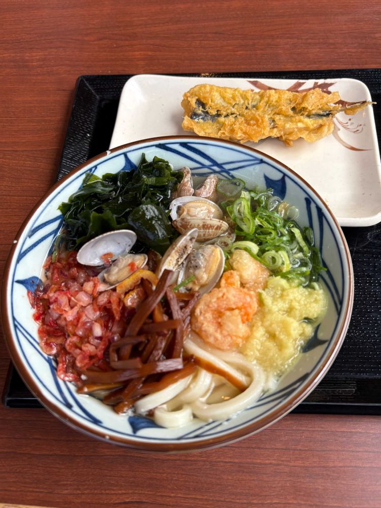 ②帰りに食べたうどん。揚げたてのイワシの天ぷらが美味しかった😋